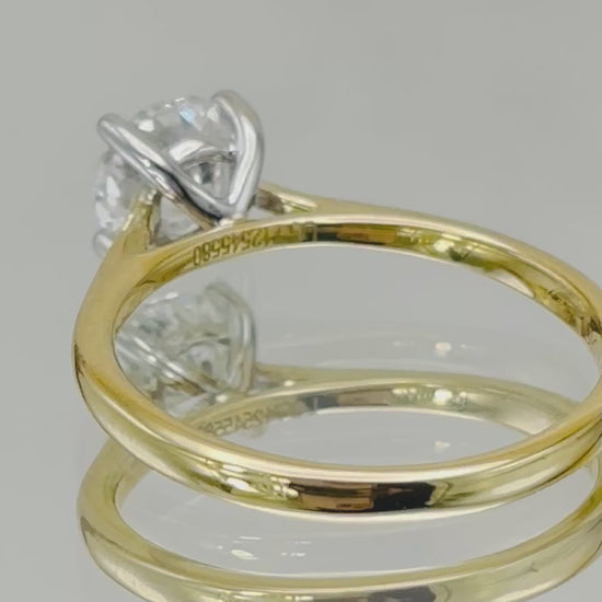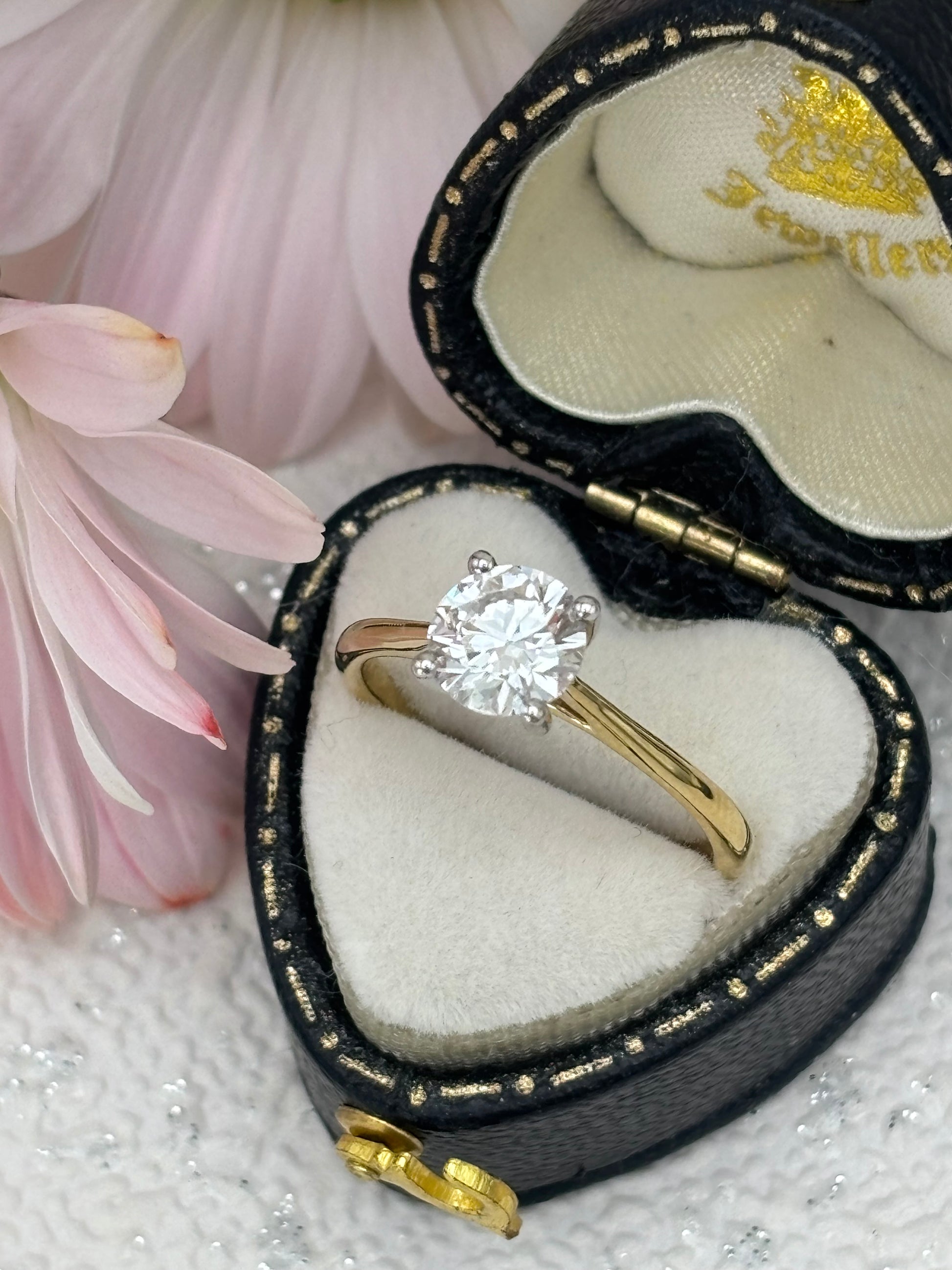 Discover refined beauty with this 1.00ct lab-created diamond solitaire, a masterpiece of understated luxury. The brilliant diamond is elegantly presented in a white gold setting, paired with a graceful 18ct yellow gold band that adds warmth and distinction. This thoughtfully designed combination honours classic tradition whilst maintaining contemporary appeal, creating a piece of jewellery that will be treasured for generations.