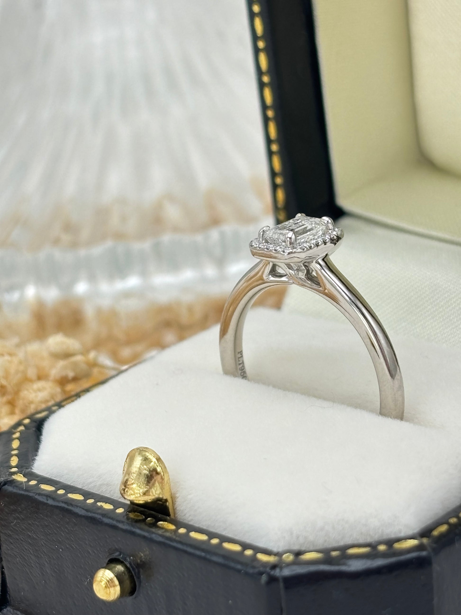 This platinum engagement ring features an exquisite emerald cut diamond surrounded by a dazzling diamond cluster. Its elegant, timeless design merges sophistication with classic beauty, making it the perfect symbol of an eternal commitment. Stand out with brilliance that never fades.