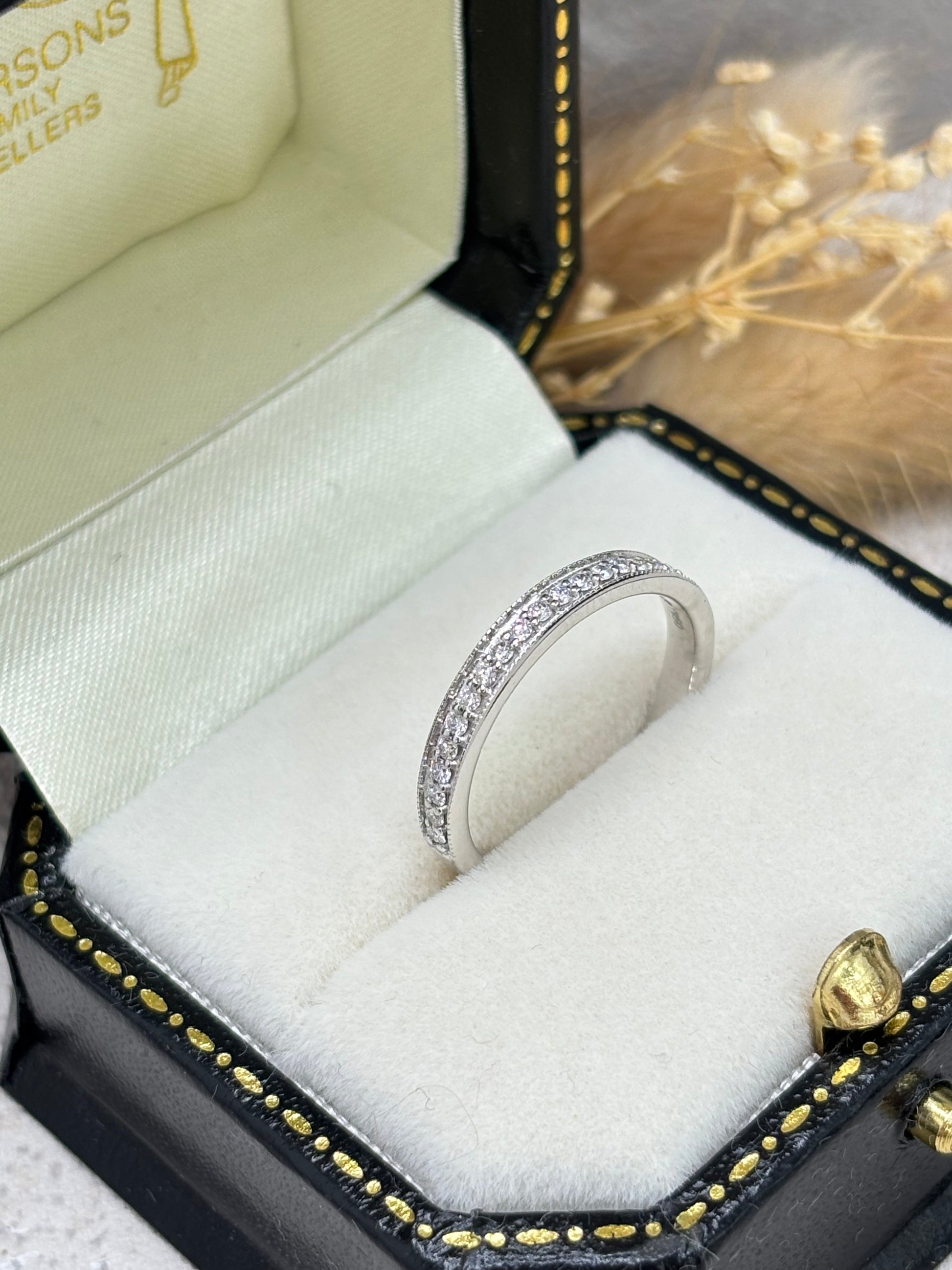 This platinum vintage-inspired eternity ring features a collection of finely grain-set diamonds, designed to reflect timeless elegance.