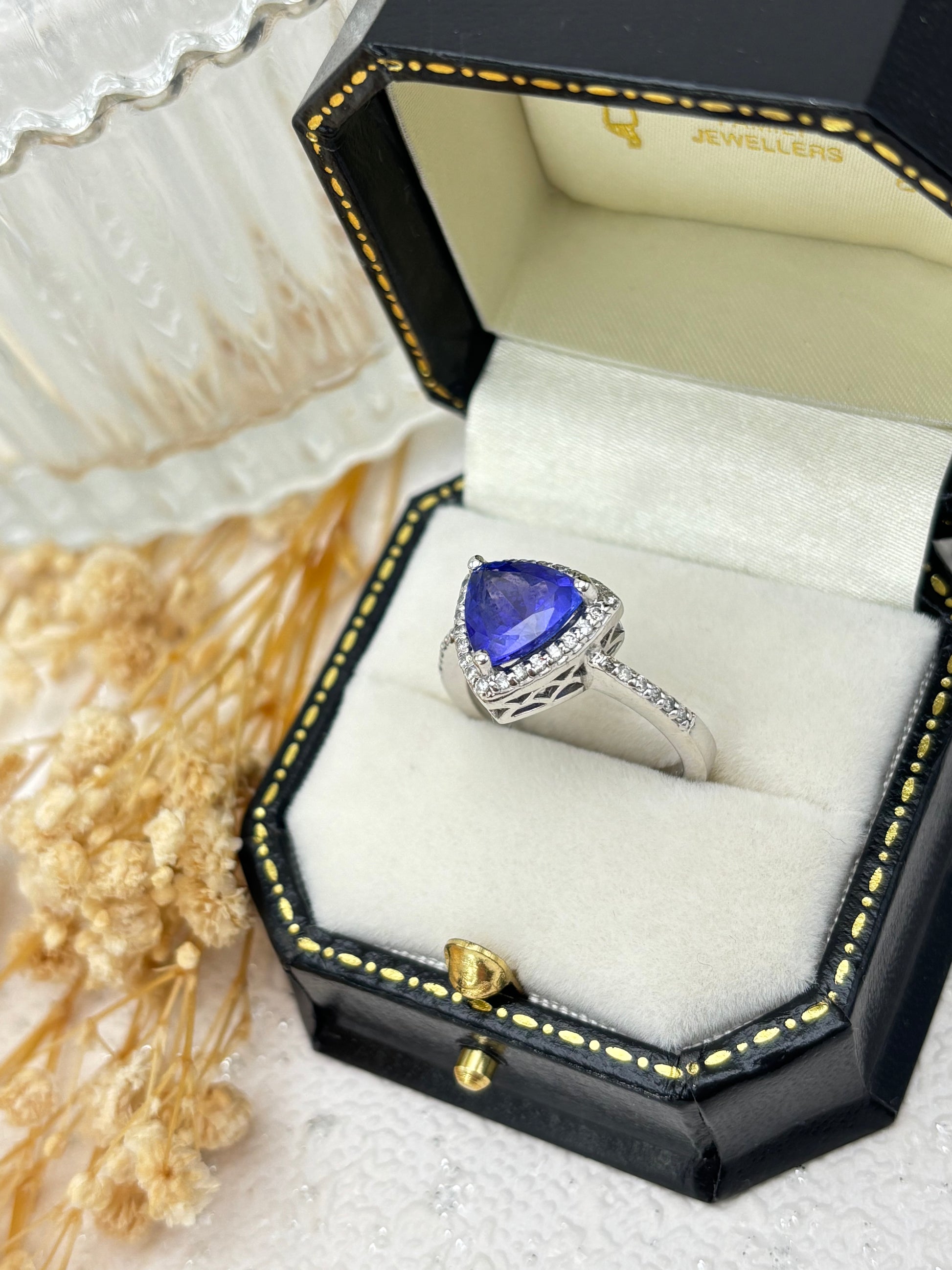This bespoke design boasts a dazzling Trilliant cut Tanzanite set in a halo crown adorned with diamonds.